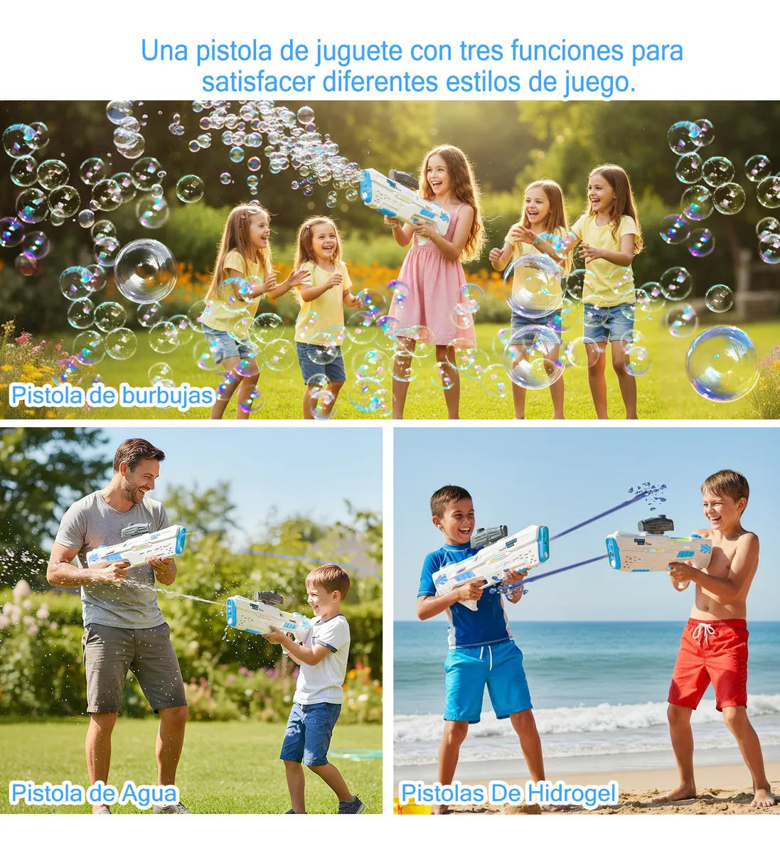 ¡La diversión se triplica! No es solo una pistola de hidrogel; también lanza ráfagas de burbujas y chorros de agua. El juguete definitivo para este verano.